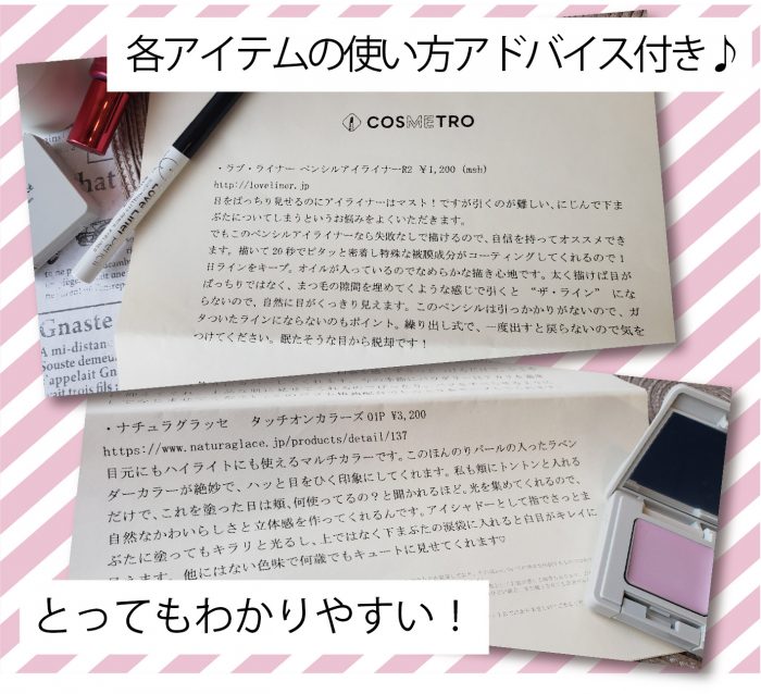 コスメトロは2ヶ月に1回の定期コースなのですが、使用後カルテを書いて送れば、2回目はさらにアップデートされた「私仕立て」のコスメが届くみたいです♪