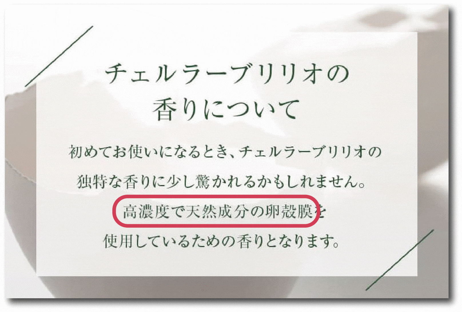 ↓公式ページにも書いてありましたが、この香りは卵殻膜特有のもの。