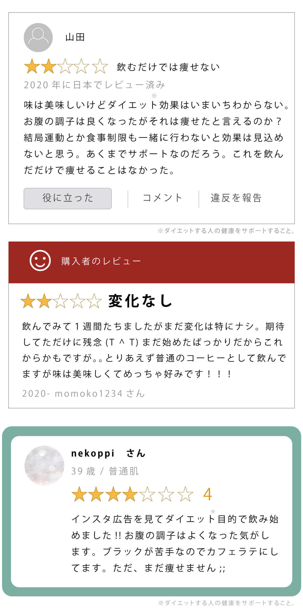 色々見ていると「お腹の調子は良くなるけど、痩せなかった;;」という意見もちらほら。