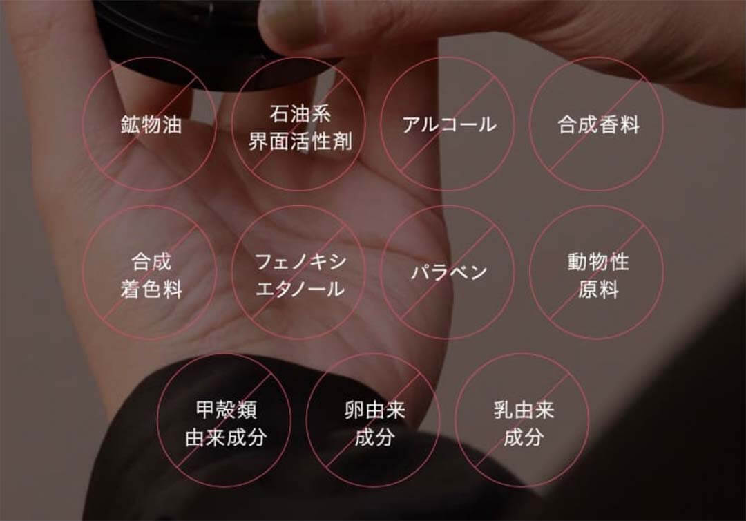 *6:鉱物油、石油系界面活性剤、アルコール、合成香料、合成着色料、フェノキシエタノール、パラベン、動物性原料、甲殻類由来成分、卵由来成分、乳由来成分