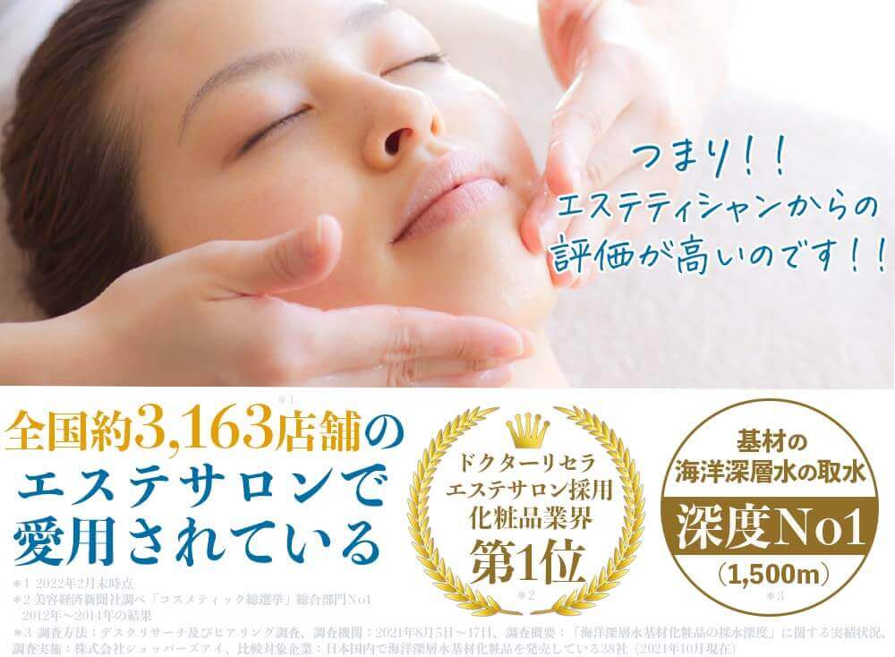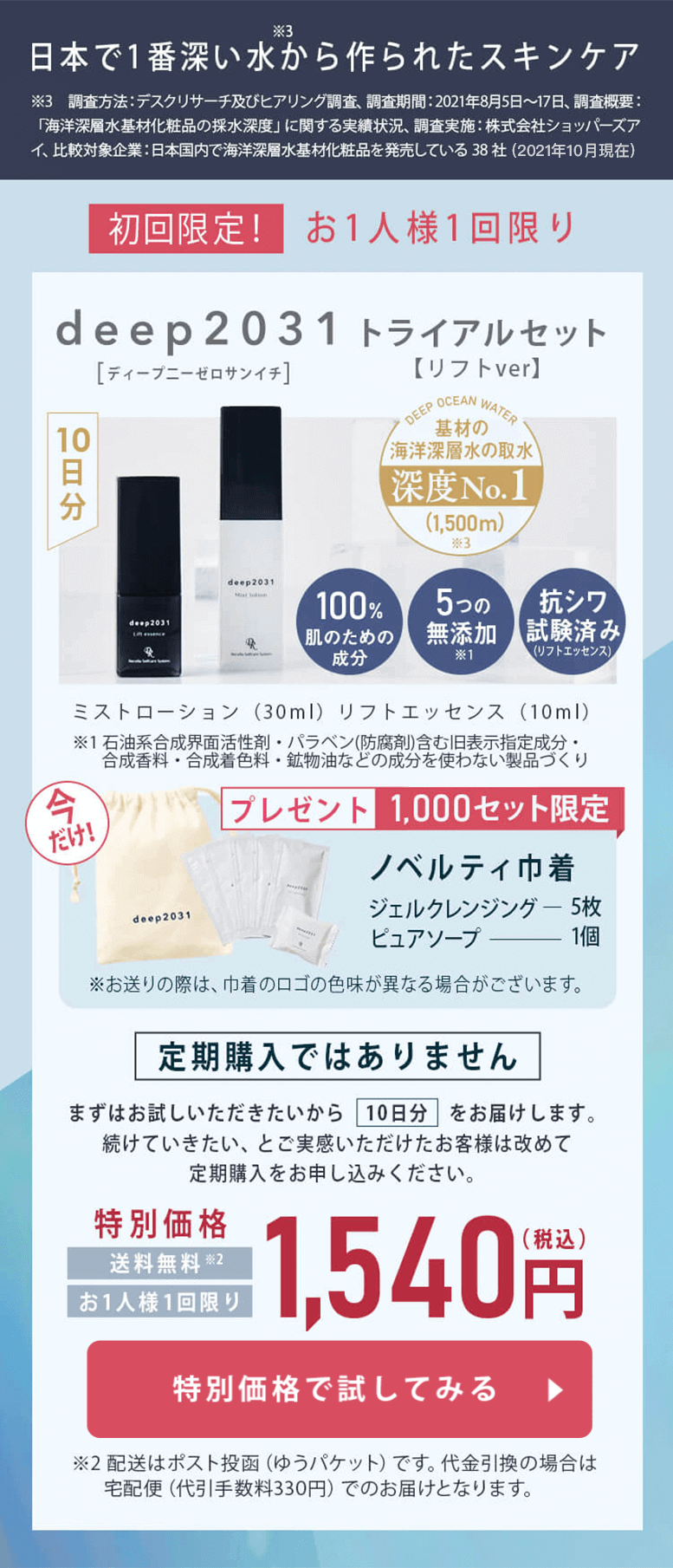*3 2022年2月末時点 *4 角質層まで *5 海洋深層水を基剤とする日本の化粧品の中でdeep2031は取水深度がNo.1(1,500m、2021年10月現在) (調査方法:デスクリサーチ及びヒアリング調査/調査期間:2021年8月5日~17日/調査概要:「海洋深層水基材化粧品の採水深度」に関する実績状況 /調査実施:株式会社ショッパーズアイ/比較対象企業:日本国内で海洋深層水基材化粧品を発売している38社(2021年10月現在) *6 美容経済新聞社調べ「コスメティック総選挙」総合部門No1 2012〜2014年の結果 *7 ADS初回セット購入者数 2022年2月末時点